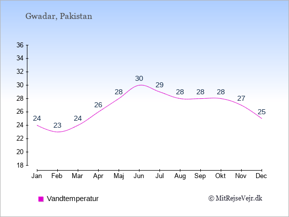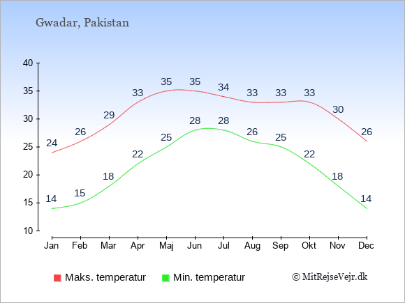 Grafen viser de gennemsnitlige maksimale temperaturer i Gwadar (som oftest den værdi, der er målt midt på dagen) og de gennemsnitlige minimale temperaturer (som oftest den værdi, der er målt midt om natten).