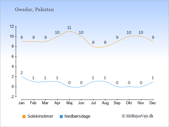 Grafen viser antallet af solskinstimer i Gwadar (d.v.s. det gennemsnitlige antal timer pr. dag hvor solen skinner), samt antallet af nedbørsdage (d.v.s. det gennemsnitlige antal dage i en given måned,