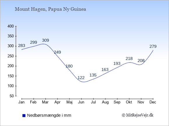Her på siden kan du få et samlet overblik over det gennemsnitlige klima i Mount Hagen måned for måned sammenlignet med klimaet i København. Oplysningerne om det historiske klima kan du bruge til at planlægge din ferie og finde det bedste tidspunkt at rejse til Mount Hagen på.