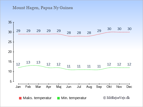 Graferne viser de gennemsnitlige maksimale temperaturer i Mount Hagen og København (typisk når solen står højest på himmelen om eftermiddagen) og de gennemsnitlige minimale temperaturer (typisk den laveste temperatur som måles om natten).