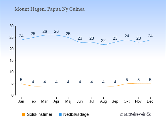 Graferne viser det gennemsnitlige antal solskinstimer i Mount Hagen pr. dag samt det gennemsnitlige antal dage med nedbør i Mount Hagen sammenlignet med København.