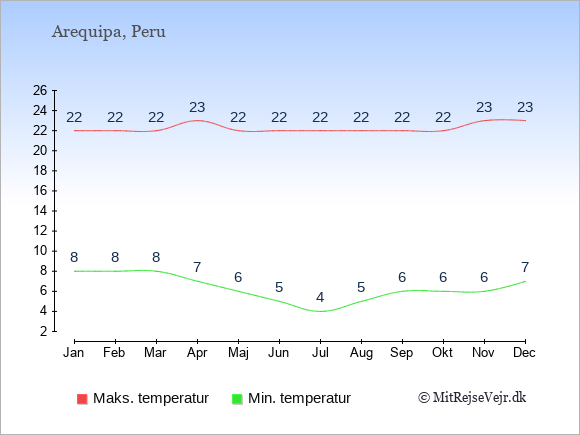 Grafen viser de gennemsnitlige maksimale temperaturer i Arequipa (som oftest den værdi, der er målt midt på dagen) og de gennemsnitlige minimale temperaturer (som oftest den værdi, der er målt midt om natten).