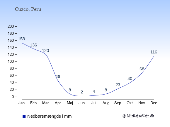 Hvis du vil se, hvordan vejret i Cuzco adskiller sig fra vejret derhjemme, kan du sammenligne tallene måned for måned med de tilsvarende tal for Danmark under Cuzco: klima & vejr.