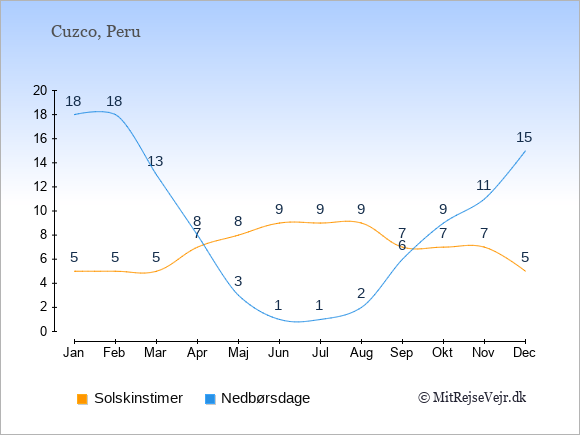 Grafen viser antallet af solskinstimer i Cuzco (d.v.s. det gennemsnitlige antal timer pr. dag hvor solen skinner), samt antallet af nedbørsdage (d.v.s. det gennemsnitlige antal dage i en given måned,