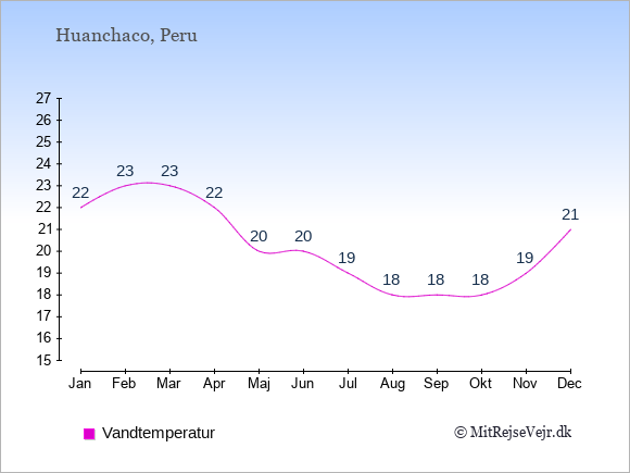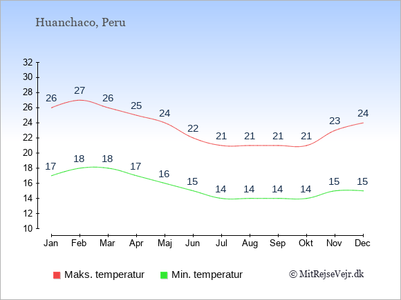 Grafen viser de gennemsnitlige maksimale temperaturer i Huanchaco (som oftest den værdi, der er målt midt på dagen) og de gennemsnitlige minimale temperaturer (som oftest den værdi, der er målt midt om natten).