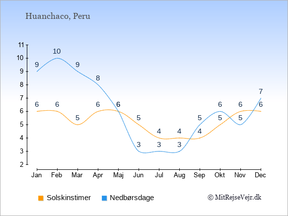 Grafen viser antallet af solskinstimer i Huanchaco (d.v.s. det gennemsnitlige antal timer pr. dag hvor solen skinner), samt antallet af nedbørsdage (d.v.s. det gennemsnitlige antal dage i en given måned,