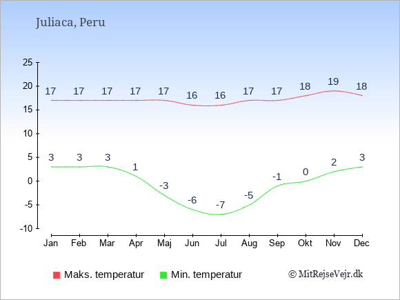 Grafen viser de gennemsnitlige maksimale temperaturer i Juliaca (som oftest den værdi, der er målt midt på dagen) og de gennemsnitlige minimale temperaturer (som oftest den værdi, der er målt midt om natten).