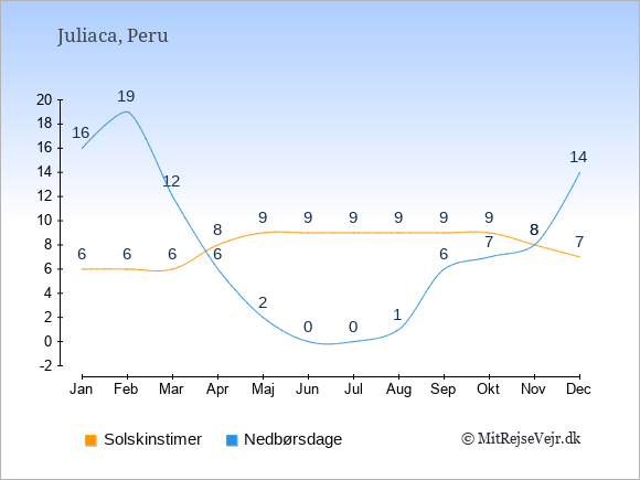 Grafen viser antallet af solskinstimer i Juliaca (d.v.s. det gennemsnitlige antal timer pr. dag hvor solen skinner), samt antallet af nedbørsdage (d.v.s. det gennemsnitlige antal dage i en given måned,