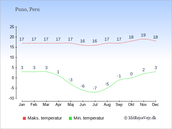 Grafen viser de gennemsnitlige maksimale temperaturer i Puno (som oftest den værdi, der er målt midt på dagen) og de gennemsnitlige minimale temperaturer (som oftest den værdi, der er målt midt om natten).