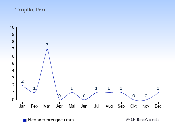 Hvis du vil se, hvordan vejret i Trujillo adskiller sig fra vejret derhjemme, kan du sammenligne tallene måned for måned med de tilsvarende tal for Danmark under Trujillo: klima & vejr.