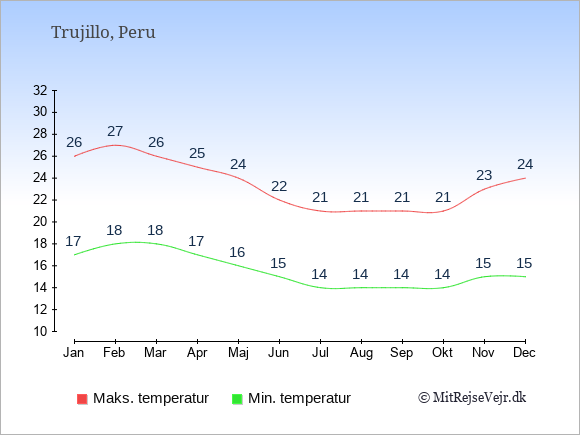 Grafen viser de gennemsnitlige maksimale temperaturer i Trujillo (som oftest den værdi, der er målt midt på dagen) og de gennemsnitlige minimale temperaturer (som oftest den værdi, der er målt midt om natten).