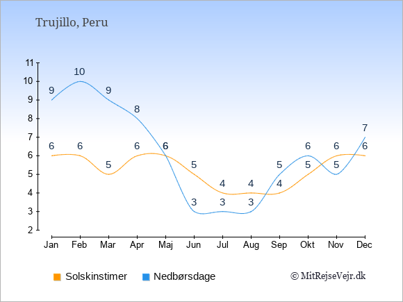 Grafen viser antallet af solskinstimer i Trujillo (d.v.s. det gennemsnitlige antal timer pr. dag hvor solen skinner), samt antallet af nedbørsdage (d.v.s. det gennemsnitlige antal dage i en given måned,