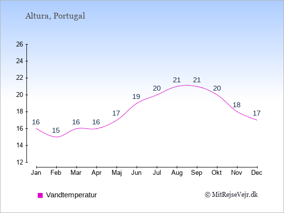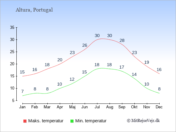 Grafen viser de gennemsnitlige maksimale temperaturer i Altura (som oftest den værdi, der er målt midt på dagen) og de gennemsnitlige minimale temperaturer (som oftest den værdi, der er målt midt om natten).