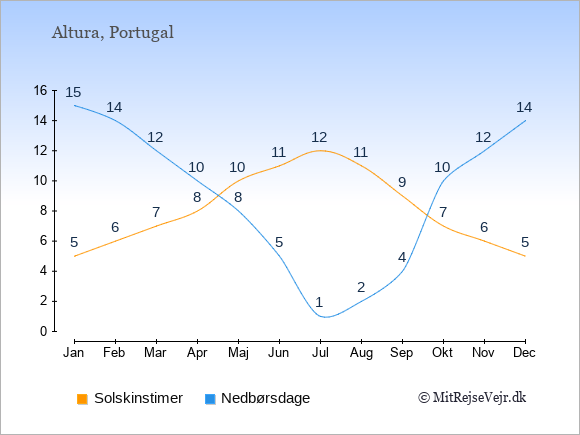 Grafen viser antallet af solskinstimer i Altura (d.v.s. det gennemsnitlige antal timer pr. dag hvor solen skinner), samt antallet af nedbørsdage (d.v.s. det gennemsnitlige antal dage i en given måned,
