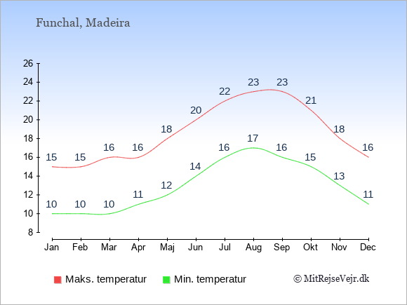 Grafen viser de gennemsnitlige maksimale temperaturer i Funchal (som oftest den værdi, der er målt midt på dagen) og de gennemsnitlige minimale temperaturer (som oftest den værdi, der er målt midt om natten).