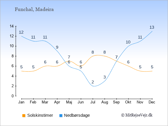 Grafen viser antallet af solskinstimer i Funchal (d.v.s. det gennemsnitlige antal timer pr. dag hvor solen skinner), samt antallet af nedbørsdage (d.v.s. det gennemsnitlige antal dage i en given måned,