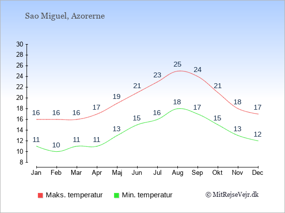 Grafen viser de gennemsnitlige maksimale temperaturer på Sao Miguel (som oftest den værdi, der er målt midt på dagen) og de gennemsnitlige minimale temperaturer (som oftest den værdi, der er målt midt om natten).