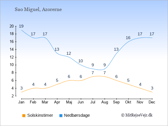Grafen viser antallet af solskinstimer på Sao Miguel (d.v.s. det gennemsnitlige antal timer pr. dag hvor solen skinner), samt antallet af nedbørsdage (d.v.s. det gennemsnitlige antal dage i en given måned,