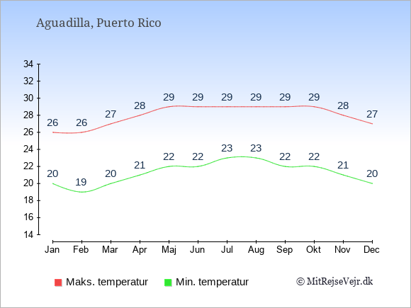 Graferne viser de gennemsnitlige maksimale temperaturer i Aguadilla og København (typisk når solen står højest på himmelen om eftermiddagen) og de gennemsnitlige minimale temperaturer (typisk den laveste temperatur som måles om natten).
