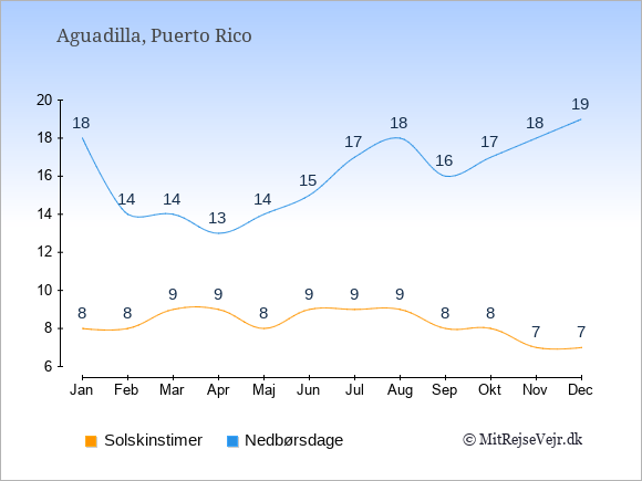 Graferne viser det gennemsnitlige antal solskinstimer i Aguadilla pr. dag samt det gennemsnitlige antal dage med nedbør i Aguadilla sammenlignet med København.