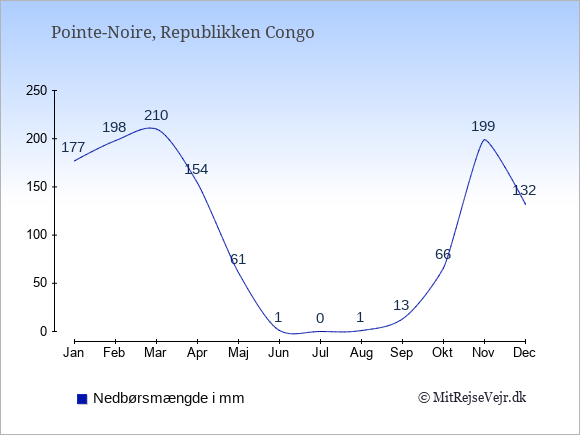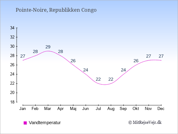 Se klimadata for Pointe-Noire sammenlignet med klimaet i Danmark.