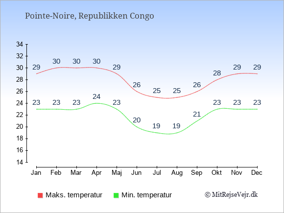 Graferne viser de gennemsnitlige maksimale temperaturer i Pointe-Noire og København (typisk når solen står højest på himmelen om eftermiddagen) og de gennemsnitlige minimale temperaturer (typisk den laveste temperatur som måles om natten).