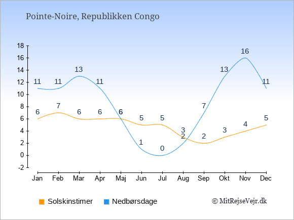 Graferne viser det gennemsnitlige antal solskinstimer i Pointe-Noire pr. dag samt det gennemsnitlige antal dage med nedbør i Pointe-Noire sammenlignet med København.
