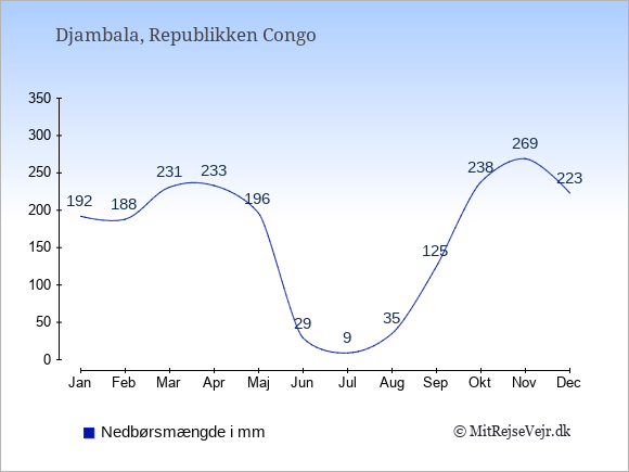 Få et samlet overblik over vejret i Djambala året rundt med temperaturer, solskinstimer og nedbør.