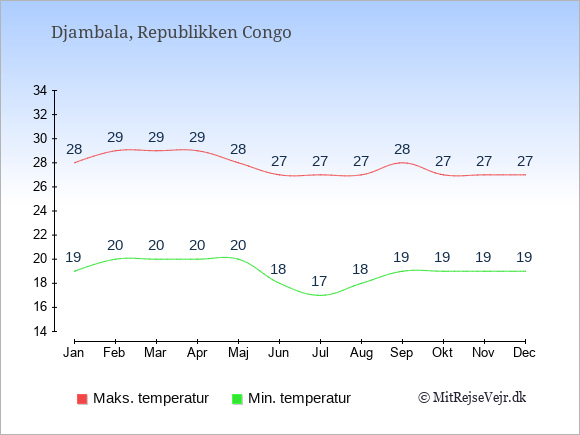 Grafen viser de gennemsnitlige maksimale temperaturer i Djambala (som oftest den værdi, der er målt midt på dagen) og de gennemsnitlige minimale temperaturer (som oftest den værdi, der er målt midt om natten).