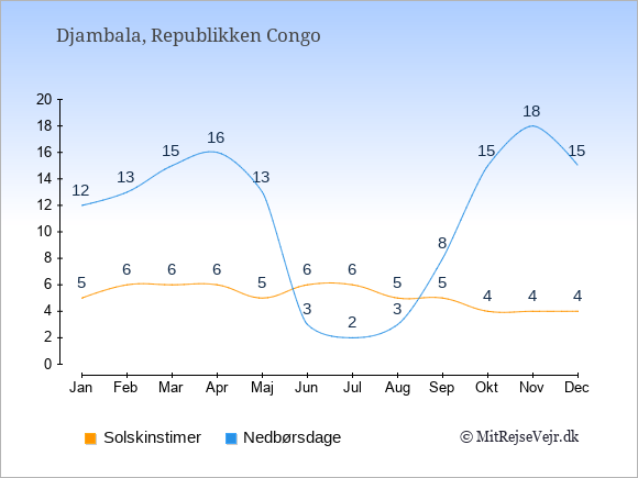 Grafen viser antallet af solskinstimer i Djambala (d.v.s. det gennemsnitlige antal timer pr. dag hvor solen skinner), samt antallet af nedbørsdage (d.v.s. det gennemsnitlige antal dage i en given måned,