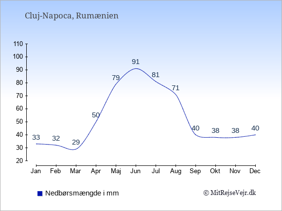 Se klimadata for Cluj-Napoca sammenlignet med klimaet i Danmark.