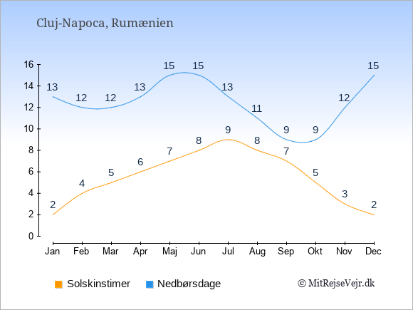 Graferne viser det gennemsnitlige antal solskinstimer i Cluj-Napoca pr. dag samt det gennemsnitlige antal dage med nedbør i Cluj-Napoca sammenlignet med København.