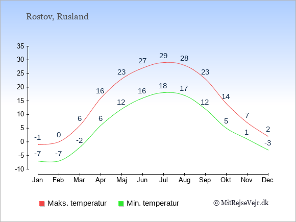 Grafen viser de gennemsnitlige maksimale temperaturer i Rostov (som oftest den værdi, der er målt midt på dagen) og de gennemsnitlige minimale temperaturer (som oftest den værdi, der er målt midt om natten).