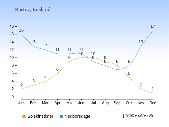 Grafen viser antallet af solskinstimer i Rostov (d.v.s. det gennemsnitlige antal timer pr. dag hvor solen skinner), samt antallet af nedbørsdage (d.v.s. det gennemsnitlige antal dage i en given måned,