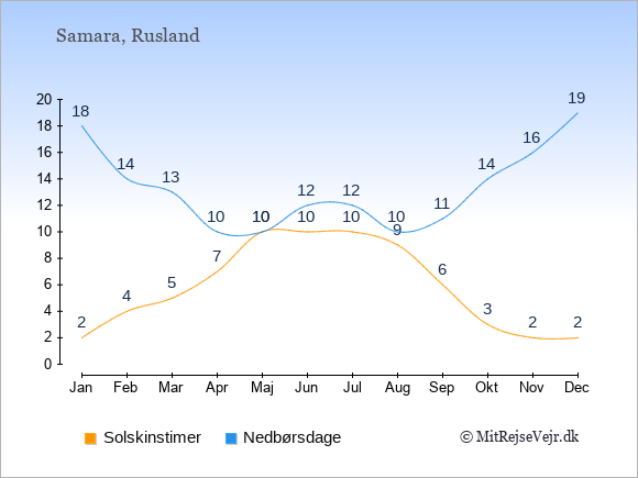 Grafen viser antallet af solskinstimer i Samara (d.v.s. det gennemsnitlige antal timer pr. dag hvor solen skinner), samt antallet af nedbørsdage (d.v.s. det gennemsnitlige antal dage i en given måned,