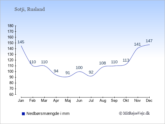 Hvis du vil se, hvordan vejret i Sotji adskiller sig fra vejret derhjemme, kan du sammenligne tallene måned for måned med de tilsvarende tal for Danmark under Sotji: klima & vejr.