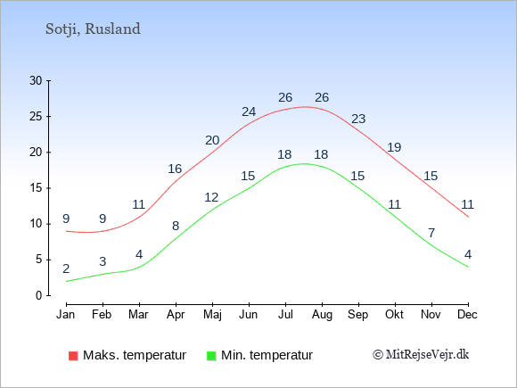Grafen viser de gennemsnitlige maksimale temperaturer i Sotji (som oftest den værdi, der er målt midt på dagen) og de gennemsnitlige minimale temperaturer (som oftest den værdi, der er målt midt om natten).
