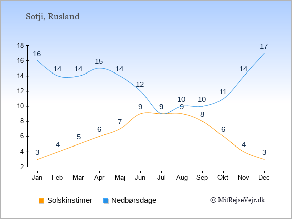 Grafen viser antallet af solskinstimer i Sotji (d.v.s. det gennemsnitlige antal timer pr. dag hvor solen skinner), samt antallet af nedbørsdage (d.v.s. det gennemsnitlige antal dage i en given måned,