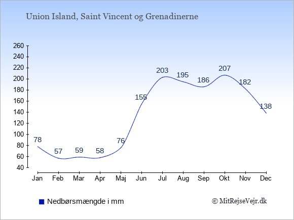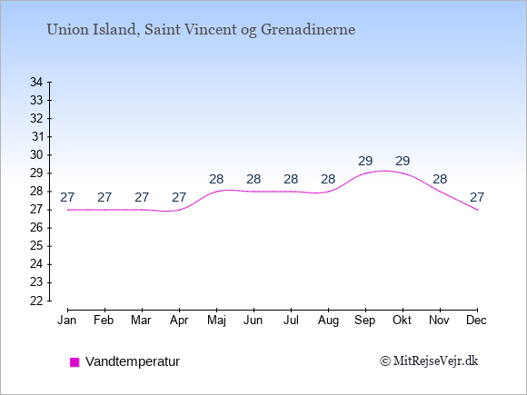 Se klimadata for Union Island sammenlignet med klimaet i Danmark.