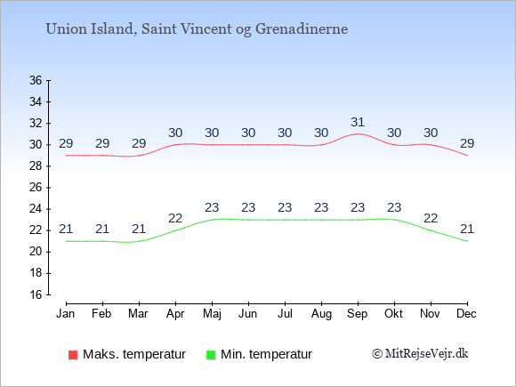 Graferne viser de gennemsnitlige maksimale temperaturer i Union Island og København (typisk når solen står højest på himmelen om eftermiddagen) og de gennemsnitlige minimale temperaturer (typisk den laveste temperatur som måles om natten).