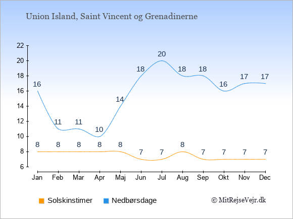 Graferne viser det gennemsnitlige antal solskinstimer i Union Island pr. dag samt det gennemsnitlige antal dage med nedbør i Union Island sammenlignet med København.