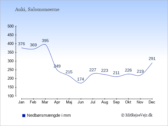 Vejret i Auki er som regel bedst i de måneder, hvor der er mange solskinstimer og få nedbørsdage.