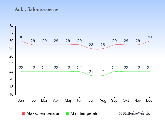 Grafen viser de gennemsnitlige maksimale temperaturer i Auki (som oftest den værdi, der er målt midt på dagen) og de gennemsnitlige minimale temperaturer (som oftest den værdi, der er målt midt om natten).
