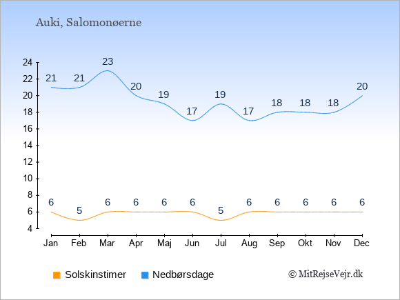 Grafen viser antallet af solskinstimer i Auki (d.v.s. det gennemsnitlige antal timer pr. dag hvor solen skinner), samt antallet af nedbørsdage (d.v.s. det gennemsnitlige antal dage i en given måned,