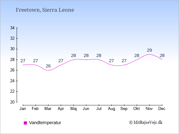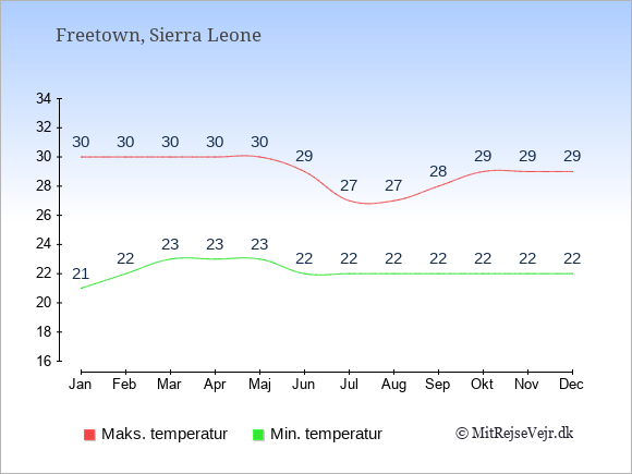 Grafen viser de gennemsnitlige maksimale temperaturer i Freetown (som oftest den værdi, der er målt midt på dagen) og de gennemsnitlige minimale temperaturer (som oftest den værdi, der er målt midt om natten).