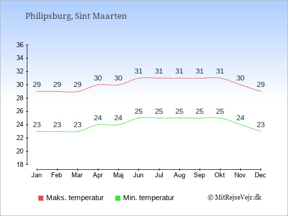 Graferne viser de gennemsnitlige maksimale temperaturer i Philipsburg og København (typisk når solen står højest på himmelen om eftermiddagen) og de gennemsnitlige minimale temperaturer (typisk den laveste temperatur som måles om natten).