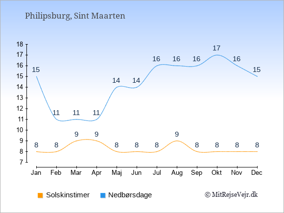 Graferne viser det gennemsnitlige antal solskinstimer i Philipsburg pr. dag samt det gennemsnitlige antal dage med nedbør i Philipsburg sammenlignet med København.