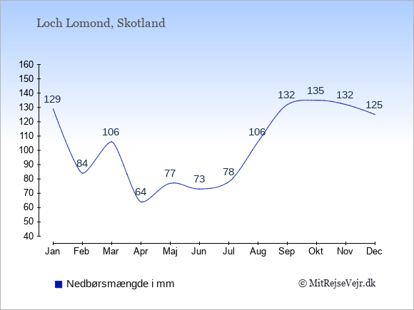 Hvis du vil se, hvordan vejret ved Loch Lomond adskiller sig fra vejret derhjemme, kan du sammenligne tallene måned for måned med de tilsvarende tal for Danmark under Loch Lomond: klima & vejr.