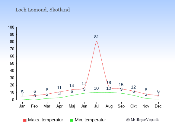 Grafen viser de gennemsnitlige maksimale temperaturer ved Loch Lomond (som oftest den værdi, der er målt midt på dagen) og de gennemsnitlige minimale temperaturer (som oftest den værdi, der er målt midt om natten).