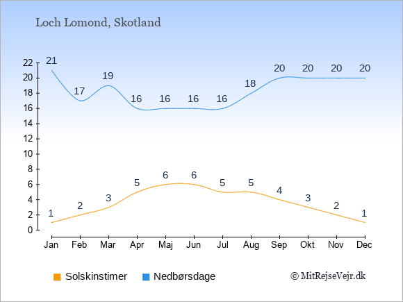 Grafen viser antallet af solskinstimer ved Loch Lomond (d.v.s. det gennemsnitlige antal timer pr. dag hvor solen skinner), samt antallet af nedbørsdage (d.v.s. det gennemsnitlige antal dage i en given måned,